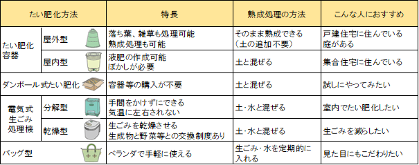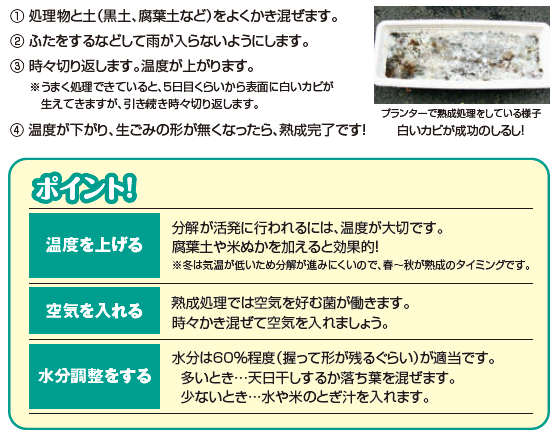 • 発泡スチロールの箱やプランター・屋外型たい肥化容器を利用したり,直接土に埋めるなどの方法があります。