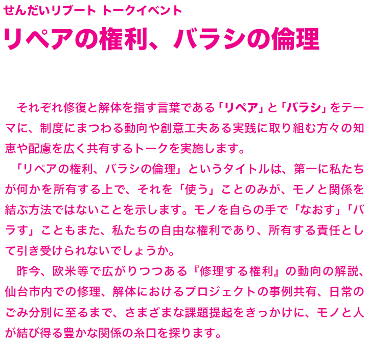 それぞれ修復と解体を指す言葉である「リペア」と「バラシ」をテーマに、欧米で広がる「修理の権利」の動向や、仙台市内の創意工夫ある取り組みの蓄積から考えるトークイベントを実施します。お気軽にご参加ください。