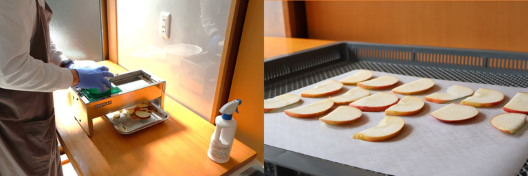 仕入れた原料は、リンゴなどの大きなものは皮ごとスライス、ブルーベリーなどの粒状のものはそのまま乾燥機へ。『ブルーブルーベリーファーム』で導入している乾燥機は、遠赤外線により低温でじっくりと水分を抜く方式が特徴です。低温乾燥により、素材の色・香り・栄養価をできる限り残すことができます。