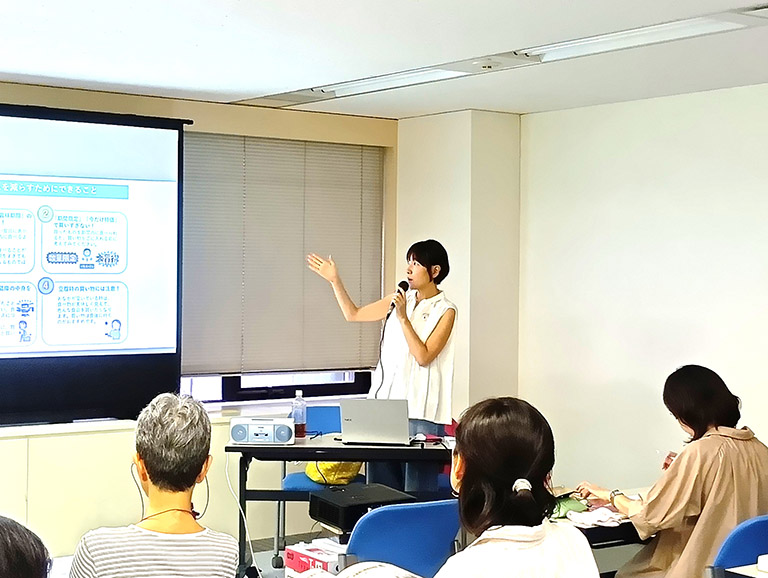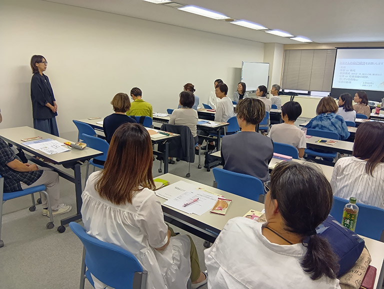 今回の講座では食品ロス削減の工夫を知るだけでなく、「食エコリーダーとして情報発信する意識の醸成」も大切なポイント。まずは人前で話すことに慣れるため、受講者全員が自己紹介を行いました。制限時間は1分間。社会活動の経験や応募の動機など、お互いのバックボーンを知ることで、少しずつ打ち解けた空気が生まれ始めます。
